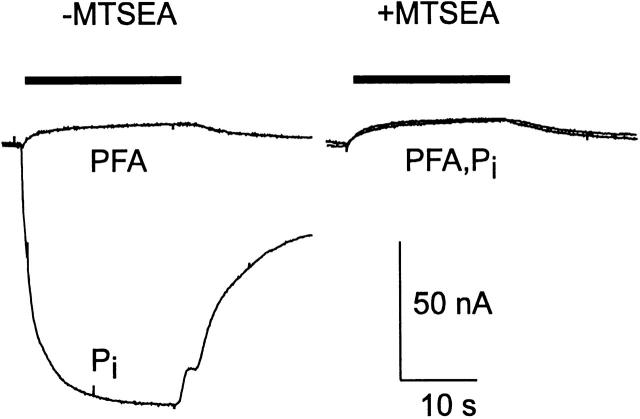 Figure 6. Effect of alkylation by MTSEA on Pi and PFA response for cells expressing S460C. Substrate was applied during the period indicated by the bar. Cell was voltage clamped to −50 mV. Note that after alkylation, the 3 mM Pi and 3 mM PFA responses superimpose and are identical to the PFA response before alkylation. Vh = −50 mV. |