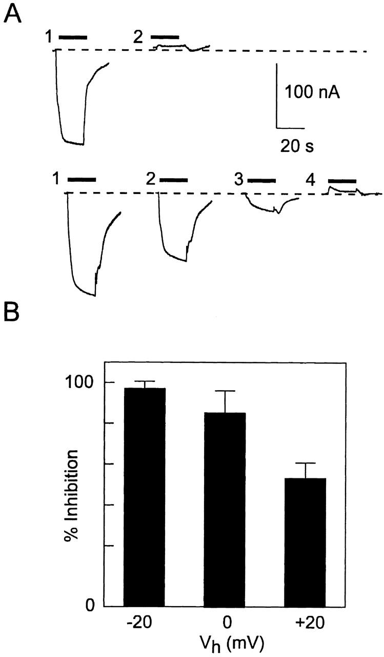Figure 8. Membrane potential protects against MTSEA suppression of Pi response only in the absence of external Na+. (A) Original recordings from two representative oocytes (top and bottom) from the same donor frog expressing S460C before and after a 2-min exposure to 10 μM MTSEA at different holding potentials. After alkylation, the response was tested each time with 1 mM Pi at −50 mV in ND100. (Top, 1) Initial response, (2) response after alkylation at +20 mV holding potential in ND100. (Bottom, 1) Initial response, (2) response after alkylation at +20 mV in ND0, (3) response after alkylation at −50 mV in ND0, (4) response after alkylation at −50 mV in ND100. The dashed line represents the initial holding current level before Pi application. (B) Pooled data of the inhibition of the Pi response after alkylation in 0 mM Na+, at three holding potentials. n = 3 (−20 mV, 0 mV); n = 5 (+20 mV). For all cells, after reexposure to MTSEA at −50 mV in ND100 solution, the Pi response was the same as the PFA response. The percent change in the Pi-induced electrogenic response was expressed as: 100 · [1 − (Ip+ + Is)/(Ip− + Is)], where Ip− and Ip+ are the Pi-induced current before and after MTSEA exposure, respectively, Is is the PFA-induced change in holding current (slippage current), with all currents expressed as magnitudes. It was assumed that the slippage was fully suppressed by 3 mM PFA so that the true Pi-induced response for saturating Pi was given by the change in current relative to the holding current during PFA exposure. |