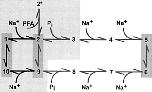 Figure 9. Kinetic Scheme for Type II Na+/Pi Cotransport. States occupied in the cis (outward facing) orientation are 1–5. States occupied in the trans (inward facing) orientation are 6–10. The three modes of operation that involve transmembrane reorientation, as revealed by steady state and pre–steady state studies of WT, are indicated by dark shading: empty carrier (10 ⇔ 1), slippage (2 ⇔ 9), and cotransport (5 ⇔ 6). At least two voltage-dependent transitions have been identified: empty carrier (10 ⇔ 1) and first external Na+ binding/release step (1 ⇔ 2). The voltage dependence of the last Na+ binding/release step on the trans side (9 ⇔ 10) has not been characterized. PFA binding places the system in state 2*, which when occupied prevents the slippage and cotransport modes. The lightly shaded region indicates those transitions and associated states that have been shown to remain intact after alkylation. In addition, the zero voltage rate constants for the empty carrier mode increase after alkylation (see text). |