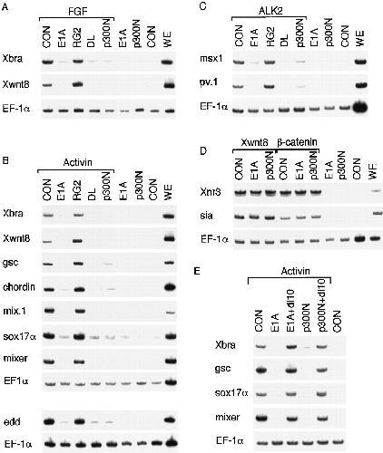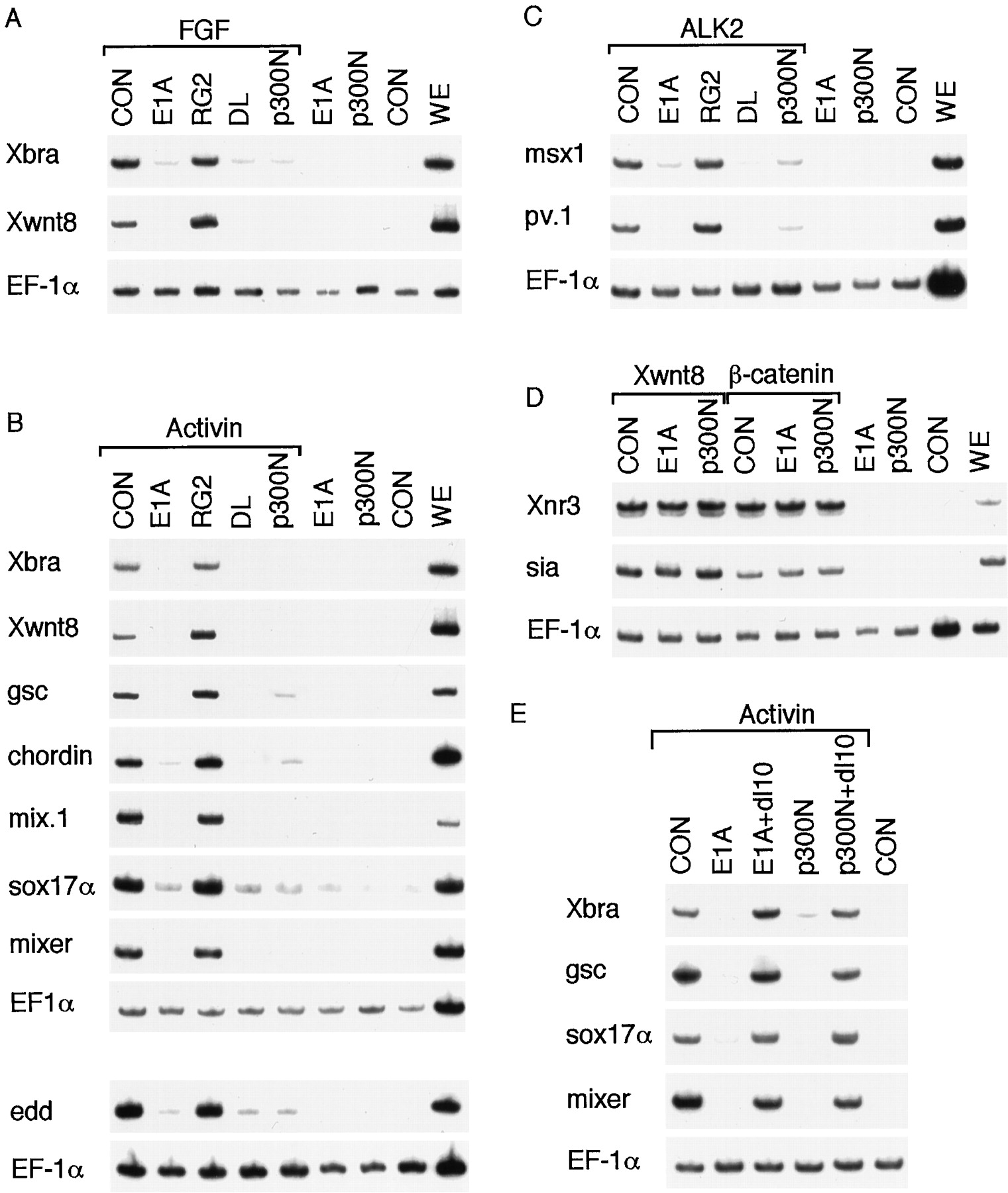 Figure 2. Inhibition of mesoderm, endoderm, and epidermis formation in animal pole explants. A, Inhibition of mesoderm markers induced by FGF examined at stage 10.5. WE is the positive control for RT-PCR, using the cDNA from whole embryos at the equivalent stage. RNA injected per embryo: 0.1 ng for E1A, RG, and DL; 3 ng for p300N. bFGF concentration is 50 ng/ml. B, Inhibition of mesoderm and endoderm markers induced by activin examined at stage 10.5. mix1 is a homeobox gene expressed in both mesoderm and endoderm. Endodermin induction by activin was examined at stage 35. The RNA amount that was injected is the same as in A. Activin concentration: 5 ng/ml (for mesoderm induction) and 50 ng/ml (for endoderm induction). C, Inhibition of early BMP-4 target genes induced by an activated ALK2, a BMP-4 receptor. RNA injected per embryo: 0.05 ng for E1A, RG, and DL; 3 ng for p300N; 0.2 ng for ALK2. D, A lack of inhibition of Xwnt-8 or b-catenin signaling. RNA injected per embryo is the same as in A, except 10 pg for Xwnt-8 and 0.1 ng for b-catenin. E, E1A or p300N inhibition of mesodermal and endodermal gene expression was rescued by p300(dl10), which has wildtype p300 function but is refractory to E1A inhibition (Eckner et al., 1994; Lee et al., 1996). RNA injected per embryo is the same as in A, except 1 ng for p300(dl10). |