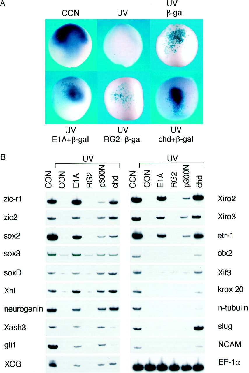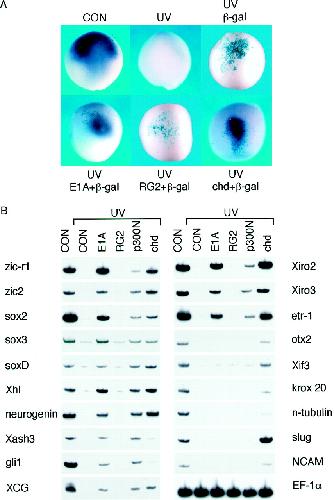Figure 4. Rescue of early neural development in UV-ventralized embryos. RNA injected per embryo: 20 pg for E1A and RG, 3 ng for p300N, and 150 pg for chordin. In situ hybridization and RT-PCR were performed on embryos at stage 14. A, Rescue of zic-r1 expression by E1A and chordin, but not by RG2 or b-galactosidase (used as a lineage-tracing marker). Note that the expression of zic-r1 overlaps with X-gal staining in E1A or chordin (chd)-injected embryos. B, Rescue of neural markers examined by RT-PCR. |