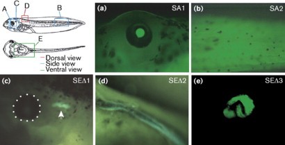 Figure 2. Gene trap embryos expressing GFP in different tissues. The top left panel shows a side view and ventral view of two tadpoles. The colored boxes outline the regions and orientation used to take each picture. (a,b) SA1 and SA2 were generated using the SAGT vector. GFP expression in SA1 was ubiquitous. (a) A magnified view of the head from SA1. Note strong expression in the lens. (b) View of the tail from SA2. Note strong expression in the somites. (c-e) SEδ1, 2 and 3 were three separate embryos containing the SEδGT gene trap vector. Each embryo expressed GFP in a distinct manner. (c) SEδ1 expressed GFP in the inner ear (otoconia; arrow), (d) SEδ2 expressed GFP in neurons flanking the spinal cord and (e) SEδ3 expressed GFP in the coiled intestine. The white dots outline the eye in (c).