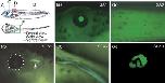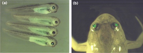 Figure 1. Germline transmission of the γ1crystallin�GFP transgene in X. laevis. (a) Image of four F1 stage 30 embryos from transgenic line 1. Note that two out of the four embryos express GFP in the lens. (b) Metamorphosed F1 froglet expressing GFP in the lens.