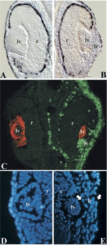 Fig. 4. Overexpression of Xlens1 causes thickening in lensectoderm and suppresses differentiation of lens fibers. (A) Differential interference contrast image of the uninjected side showing the normal histological relationship between the lens vesicle (lv) and the surface ectoderm, which is composed of two thin layers of cells. r, retina. 190 (B) The injected side of the same embryo contains a smaller lens vesicle (lv) and a thickened lensectoderm (le). r, retina. (C) Confocal image of a transverse section from stage 35. On the uninjected side (left) the expression of γ-crystallin protein (red) is comparable to that in normal, unperturbed embryos, with strong expression in the fibers of the lens vesicle (lv). On the injected side (right), γ-crystallin expression is confined to the fibers of a greatly reduced lens vesicle. The thickened lensectoderm expresses high levels of Xlens1 (green). 190 (D,E) Cell nuclei stained with Hoechst. On control side (D), the ectoderm overlying the lens vesicle (lv) is 2 cell layers thick. On the injected side (E), the thickened ectoderm is 4-6 cell layers thick (between arrows). Magnification, 190(A-C), 240(D,ε).