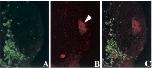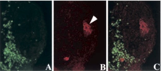Fig. 6. Overexpression of Xlens1 in selected regions of the anteriorhead of the embryo results in ectopic γ-crystallin protein expression. A duplicate set of confocal images acquired in a Z-series through 7 μm demonstrates that GFP-expression (A) and γ-crystallin expression (B) are in the same cells. In (C) the images are merged. Arrowhead in B indicates normal γ-crystallin staining in the native lens. 170