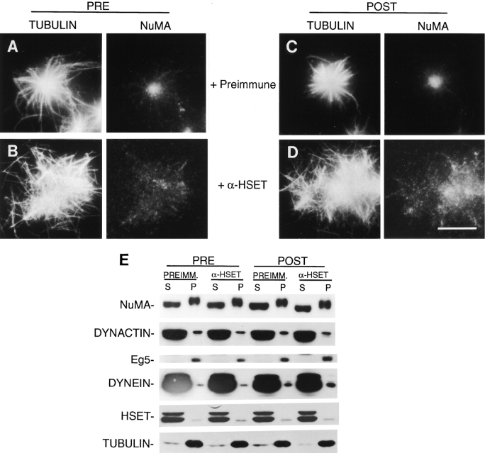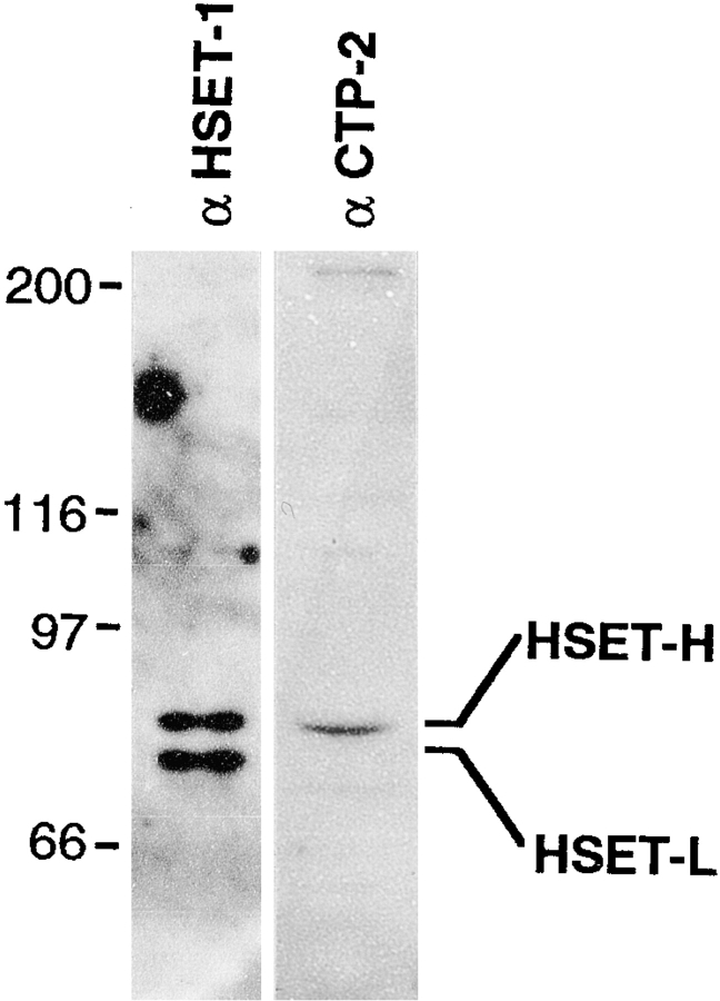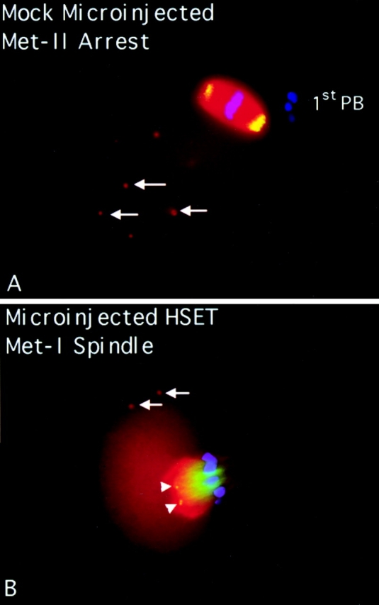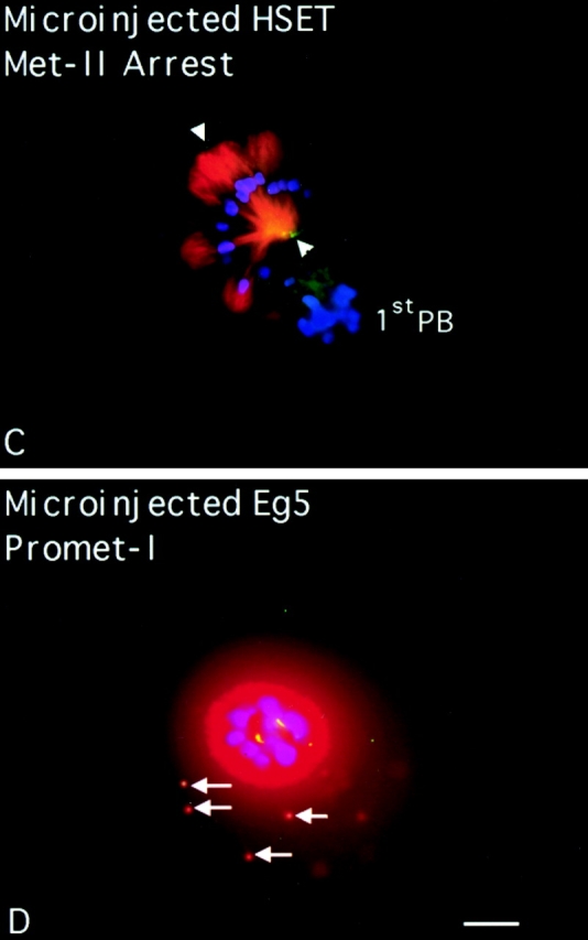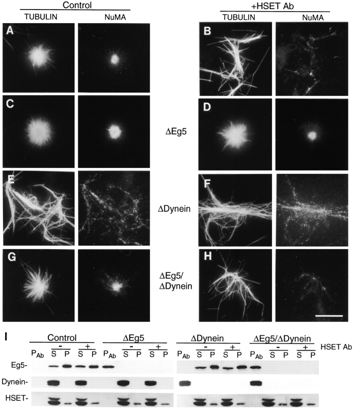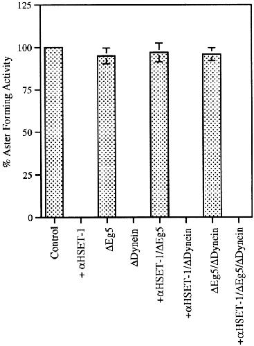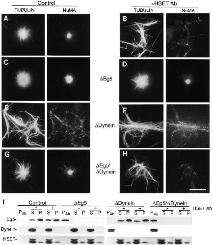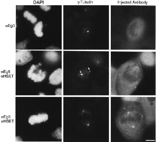 We have prepared antibodies specific for HSET, the human homologue of the KAR3 family of minus end-directed motors. Immuno-EM with these antibodies indicates that HSET frequently localizes between microtubules within the mammalian metaphase spindle consistent with a microtubule cross-linking function. Microinjection experiments show that HSET activity is essential for meiotic spindle organization in murine oocytes and taxol-induced aster assembly in cultured cells. However, inhibition of HSET did not affect mitotic spindle architecture or function in cultured cells, indicating that centrosomes mask the role of HSET during mitosis. We also show that (acentrosomal) microtubule asters fail to assemble in vitro without HSET activity, but simultaneous inhibition of HSET and Eg5, a plus end-directed motor, redresses the balance of forces acting on microtubules and restores aster organization. In vivo, centrosomes fail to separate and monopolar spindles assemble without Eg5 activity. Simultaneous inhibition of HSET and Eg5 restores centrosome separation and, in some cases, bipolar spindle formation. Thus, through microtubule cross-linking and oppositely oriented motor activity, HSET and Eg5 participate in spindle assembly and promote spindle bipolarity, although the activity of HSET is not essential for spindle assembly and function in cultured cells because of centrosomes.