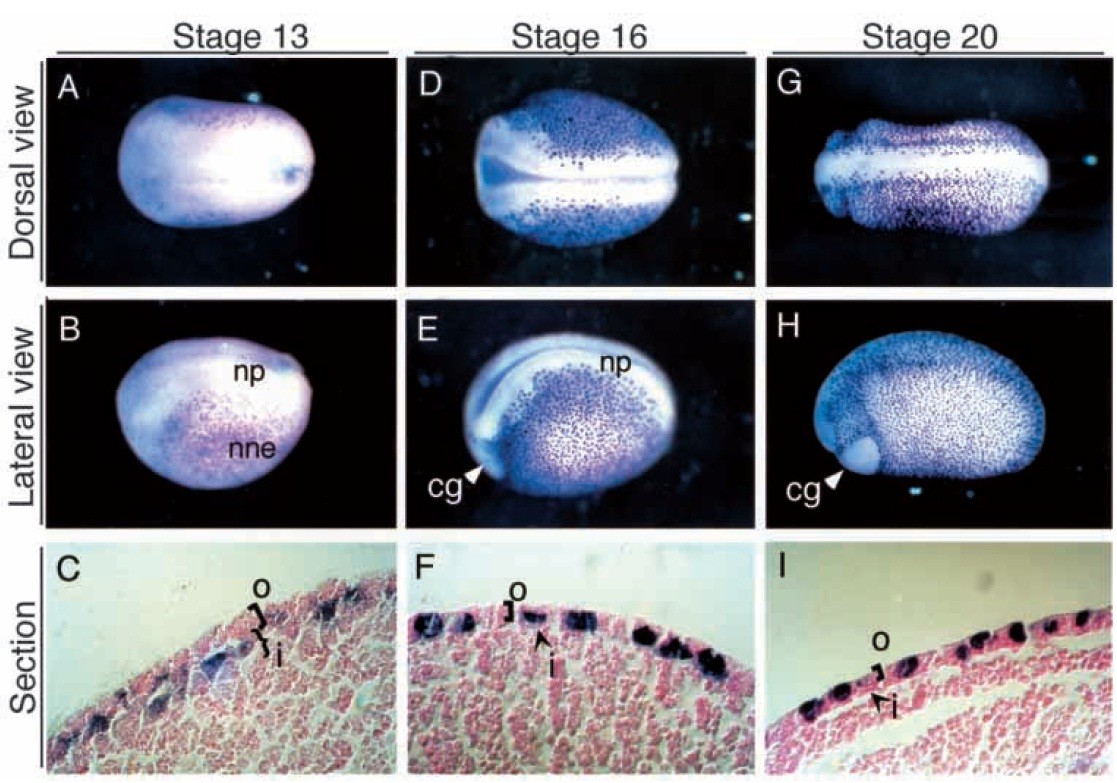 is also absent from the cement gland (cg). (C,F,I) Sections of whole-mount-stained embryos show that