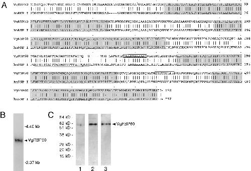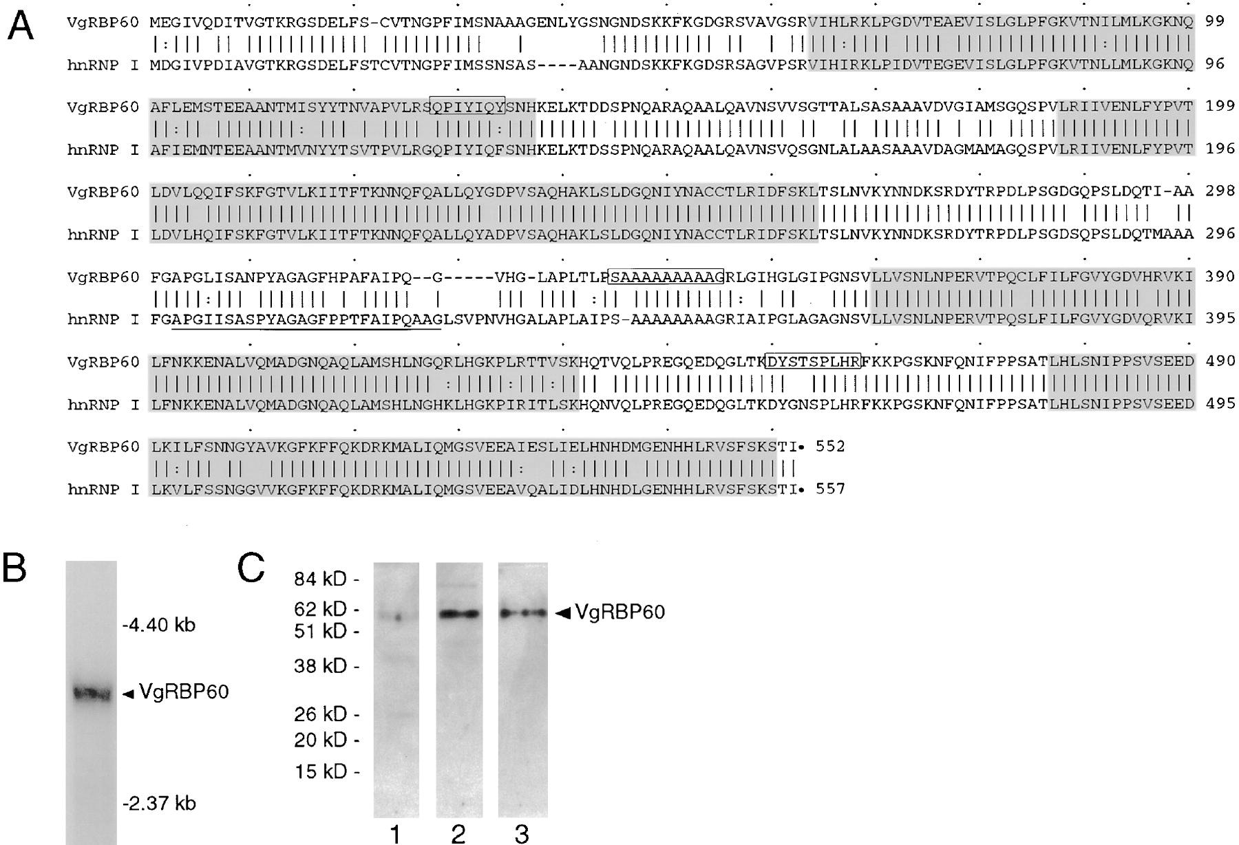 (A) The predicted amino acid sequence of VgRBP60 is aligned with that of human hnRNP I (Ghetti et al. 1992). Identical and conserved amino acids are marked between the sequences by lines and dots, respectively. The four RRM domains are shaded, and the amino acid sequence that is present in the hnRNP I isoform and absent from the predominant PTB isoform is underlined. The positions of the sequenced peptides (peptide 1 at 127â133, peptide 2 at 335â345, and peptide 3 at 450â458) are indicated by boxes.