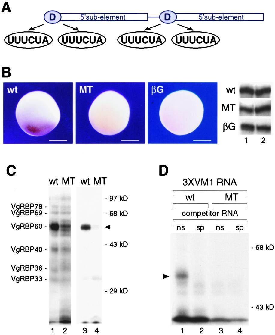 (D) Direct binding to the VM1 motif was tested by UV cross-linking analysis performed with oocyteS100 extracts and 32P-labeled 3ÃVM1 RNA transcripts containing either wild-type (wt, lanes 1 and 2) or mutated (MT, lanes 3 and 4) VM1 sequences, and either nonspecific (ns, lanes 1 and 3) or sequence-specific (sp, lanes 2 and 4) competitor RNA. Cross-linked proteins were detected by autoradiography after SDS-PAGE. The positions of VgRBP60 (arrowhead) and molecular weight markers are indicated at the right.
