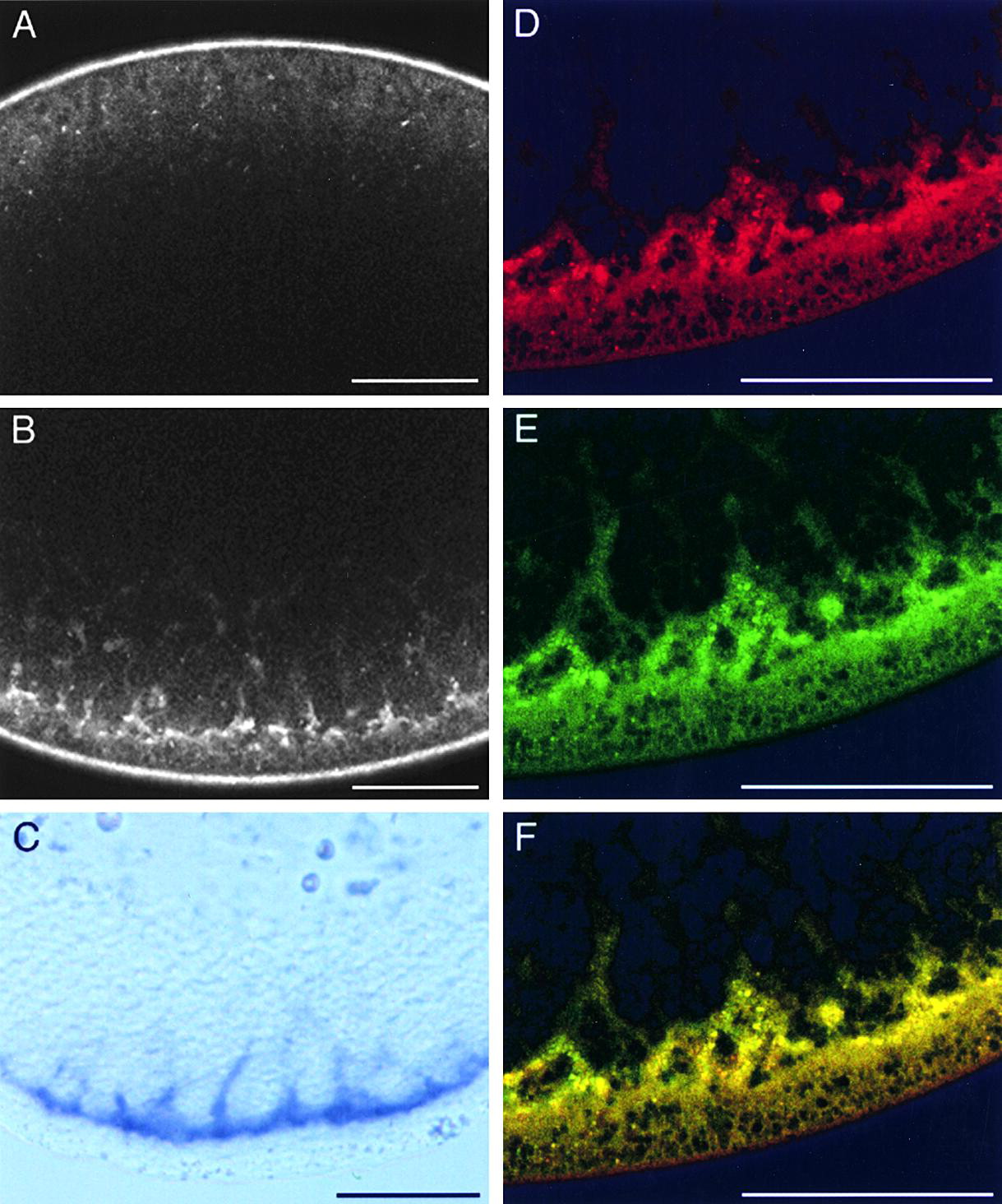 (C) Vg1 mRNA was detected in stage III oocytes, by in situ hybridization using a digoxigenin-labeled probe. Shown is a paraffin section, vegetal pole toward the bottom.
