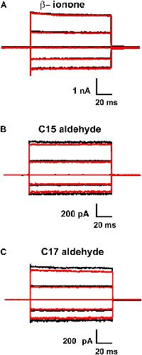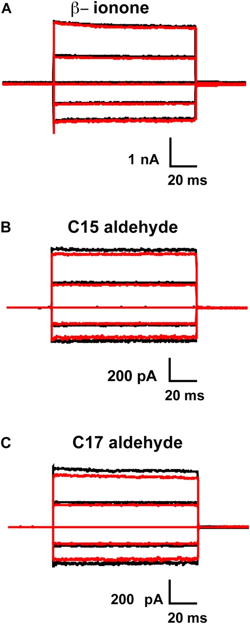 Figure 2. β-Ionone, and C15 and C17 aldehydes do not significantly inhibit the homomeric rod CNG channel in the presence of saturating cGMP. Currents were measured from multichannel, inside-out patches of homomeric (CNGA1) rod channels at saturating (2 mM) cGMP. The raw traces represent families of cGMP-activated currents in response to voltage steps ranging from −100 to +100 mV in 50-mV increments from a holding potential of 0 mV. Currents measured in the absence of cGMP were subtracted from all traces. Black traces represent currents before the addition of the indicated retinoid; red traces represent currents after 1 h (steady state) in the indicated retinoid. Similar results for β-ionone, C15, and C17 aldehyde were obtained with 9, 3, and 15 patches, respectively. (A) There was no change in current with 10 μM β-ionone. (B) Currents were reduced by 8% in 1 μM C15 aldehyde. (C) Currents were reduced by 11.5% in 1 μM C17 aldehyde.