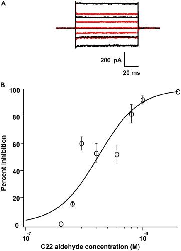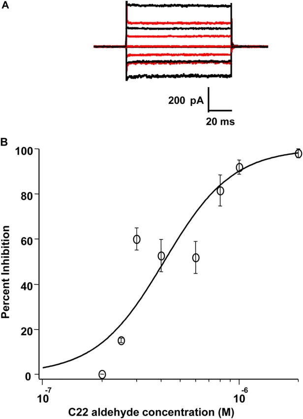 Figure 3. C22 aldehyde is a potent inhibitor of the homomeric rod CNG channel. (A) The raw traces represent families of cGMP-activated currents in response to voltage steps ranging from −100 to +100 mV in 50-mV increments from a holding potential of 0 mV. Currents measured in the absence of cGMP were subtracted from all traces. Black traces represent currents in saturating cGMP before the addition of C22 aldehyde; red traces represent currents after 1 h (steady state) in 400 nM C22 aldehyde (46% inhibition). (B) The dose–response relation for C22 aldehyde inhibition of the rod CNG channel. All points were measured at +100 mV after 1 h (steady state) in the indicated concentration of C22 aldehyde and saturating (2 mM) cGMP. Data were normalized to maximal current in 2 mM cGMP in the absence of C22 aldehyde, with leak current in the absence of cGMP subtracted from each trace. Each point is an average from two to three patches, and the smooth curve is a fit with the Hill equation, where the IC50 = 415 nM, and n = 2.5.