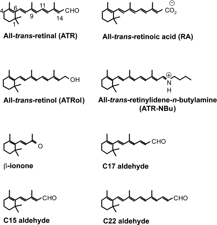 Figure 1. Structures of retinoids and retinoid analogues. All-trans-retinal (ATR), all-trans-retinol (ATRol), β-ionone, all-trans-C15 aldehyde, all-trans-retinoic acid (RA), all-trans-retinylidene-n-butylamine (ATR-NBu), all-trans-C17 aldehyde, and all-trans-C22 aldehyde. (All-trans-C15, C17, and C22 aldehydes are named based on the total number of carbons, including methyl groups, as per Buczylko et al., 1996. Though depicted as charged, the actual charge states of RA and ATR-NBu within the retinoid binding site are not known.)