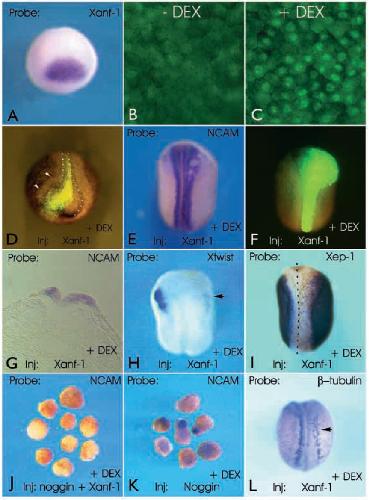 with XBF-1 probe are shown from the anterior, dorsal side up. In the DEX-treated embryo (L), the expression of XBF-1 is expanded ventrally,