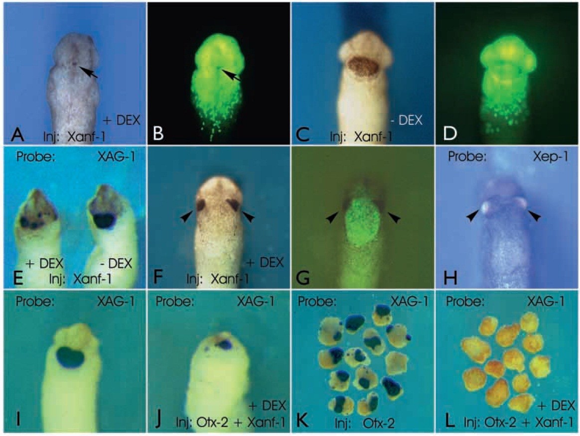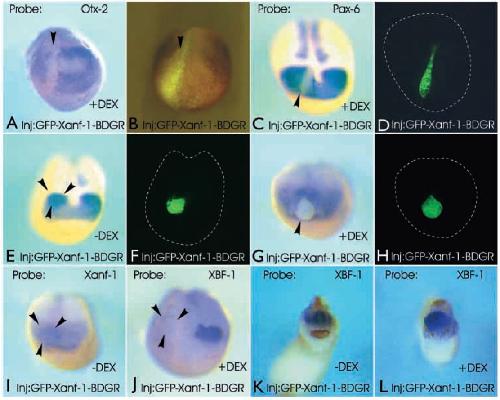 in the control embryo is revealed by XAG-1 probe. (J) Activation of GFP-Xanf-1-BDGR in embryos microinjected with the mixture of Otx-2