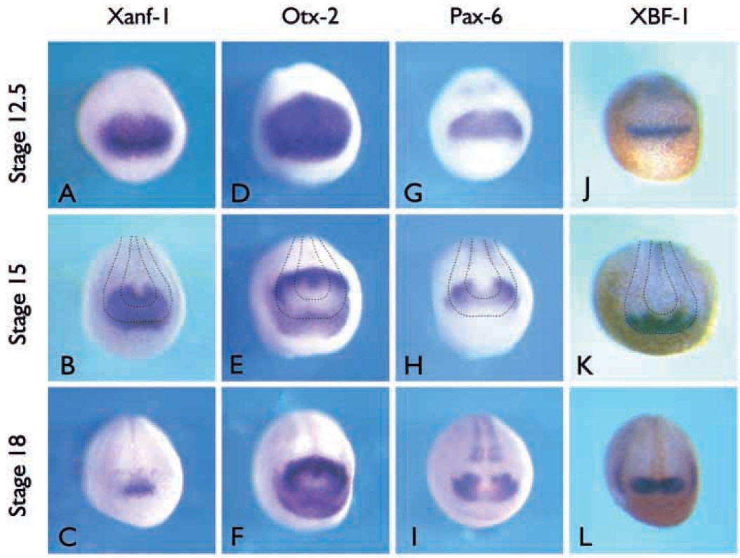 (A-C), Otx-2 (D-F), Pax-6 (G-I) and XBF-1 (J-L) mRNAs. Embryos shown from the anterior,