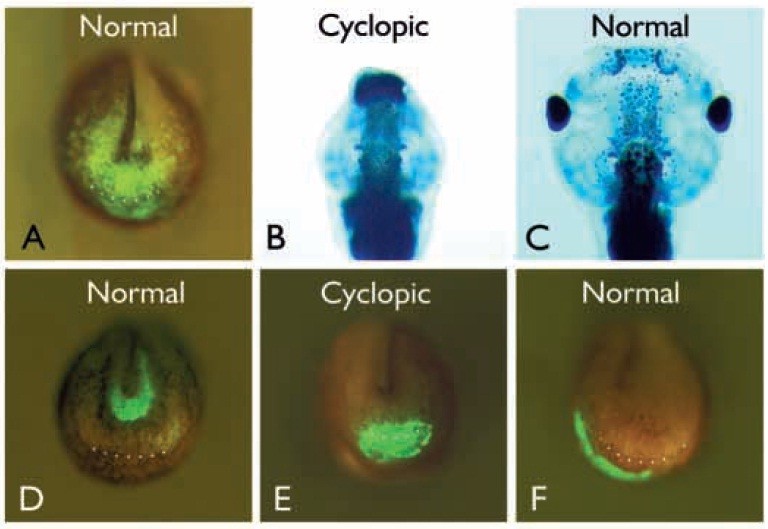 Fig. 7. (A,B). The cyclopic phenotype, characterised by eye fusion