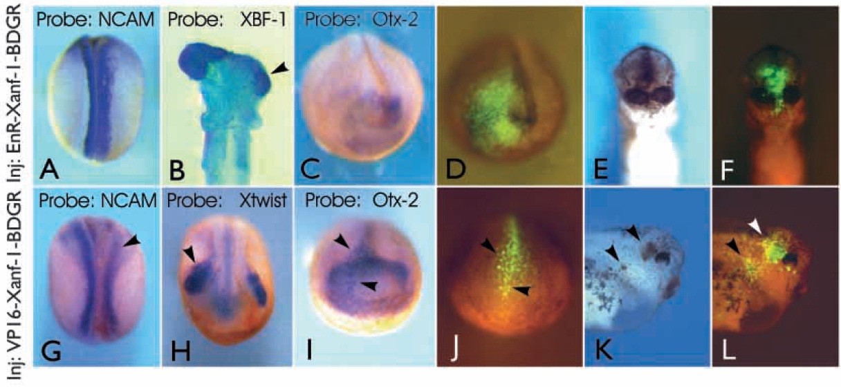 embryo produces some effects opposite to those elicited by Xanf-1 alone: downregulation of NCAM (arrowhead G), expansion of the right