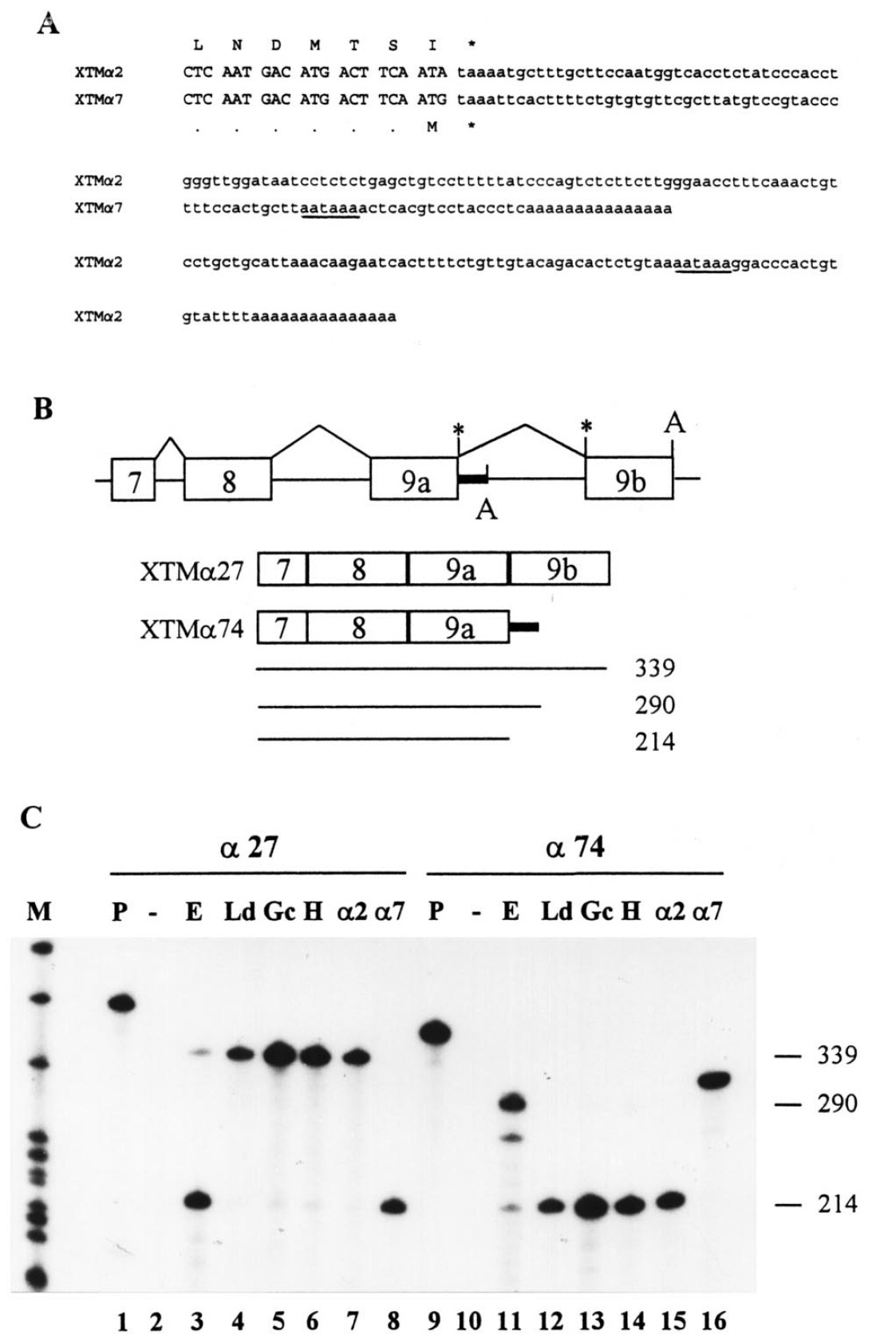 Fig. 1. XTMa2 and XTMa7 cDNA sequence alignment, schematic structure of the Xenopus laevis a-TM 3' genomic region and expression of the two transcripts in adult striated tissues. (A) Sequence alignment of the COOH terminal and 3'UTR of XTMa2 and XTMa7 sequences. Amino acid identity is indicated by dots and stop codons by (*). Polyadenylation signals are underlined. (B) Organization of the Xenopus laevis a-TM 3' genomic region and schematic representation of the two skeletal encoding mRNAs produced. Only the mRNA portions relevant to the study are shown and they correspond to XTMa27 and XTMa74 probes. The size of the protected fragments obtained in RNase protection assay are indicated below the probes. Exons are shown by open boxes and introns by solid lines. The XTMa7 3'UTR region is indicated by a thick solid line. The polyA signal (A) and stop codons (*) are shown. (C) RNase protection analysis of XTMa2 and XTMa7 transcripts. Total RNA from adult striated muscles, stage 42 embryo (E) or tRNA (2) was analysed by RNase protection with XTMa27 or XTMa74 probes. M, size markers (HpaII-digested pBluescript); muscle RNAs were from longissimus dorsi (Ld), gastrocnemius (Gc) or heart (H). Synthetic sense RNA derived from XTMa2 (a2) and XTMa7 (a7) cDNAs were used as control. The discrepancy between the size of the probes (P) and the 339 nt protected fragment for XTMa27 or the 290 nt fragment for XTMa74 probe corresponds to the polylinker sequence included in the antisense probes.
