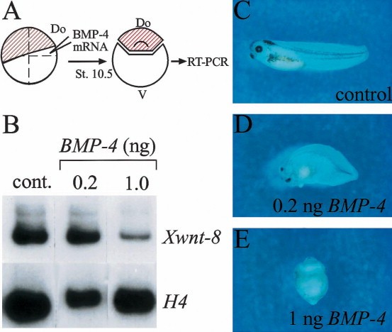 Fig. 2. Repression of Xwnt-8 by high levels of BMP-4. Embryos were injected dorsally with increasing amounts of BMP-4 mRNA. At stage 10.5 the dorsal part of the marginal zone was cut including the dorsolateral region and expression of Xwnt-8 in this region was studied by RT-PCR. Sibling embryos were allowed to develop to stage 40/41 for phenotypic analysis of the injected RNAs. (A) Schematic description of the experiment. (B) RT-PCR analysis of Xwnt-8 expression in embryos injected with 0.2 or 1 ng of BMP-4 mRNA, histone H4 served as a loading control. (C) Control untreated embryo. (D) Embryo injected with 0.2 ng of BMP-4 RNA exhibiting intermediate ventralization. (E) Injection of 1 ng of BMP-4 mRNA resulted in strong ventralization.