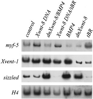 Fig. 4. Specific regulation of downstream genes by BMP-4 and Xwnt-8. Embryos were injected with Xwnt-8, BMP-4, dominant negative Xwnt-8 and dominant negative BMP receptor RNAs singly or in combination to achieve BMP-4 overexpression when Xwnt-8 signaling was blocked or Xwnt-8 overexpression when BMP signaling was blocked. Under these conditions the effect on myf-5, Xvent-1 and sizzled expression was determined by RT-PCR. The histone H4 gene served as a loading control.