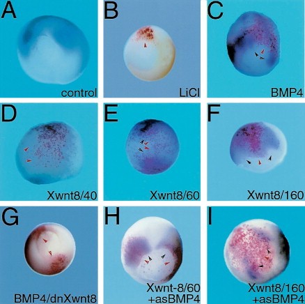 Fig. 6. Regulation of myf-5 by Xwnt-8 and BMP-4 during late gastrulation. Embryos were injected with mRNAs to manipulate the Xwnt-8 and the BMP-4 signaling pathways and the effects of these manipulations on myf-5 expression were studied. All embryos were co-injected with LacZ RNA to mark the site of injection (red). Following injection, the embryos were dorsalized by LiCl treatment. Injected embryos were fixed at stage 12 and studied by in situ hybridization (blue). (A) Control embryo exhibiting the normal myf-5 pattern of expression. (B) LiCl dorsalization suppresses the expression of myf-5. (C) High levels of BMP-4 overexpression can activate myf-5 expression but the activation is in regions bordering the site of injection. (D) Co-injection of BMP-4 and dominant negative Xwnt-8 encoding mRNAs show that the activation of myf-5 by BMP-4 requires active Xwnt-8 signaling. (E) Injection of 60 ng of an Xwnt-8 expression plasmid resulted in the activation of myf-5 expression at the site of injection. (F) Higher amounts of injected Xwnt-8 expression plasmid (160ng) result in the repression of myf-5 at the site of injection but expression can be observed in neighboring regions. (G,H) Co-injection of the Xwnt-8 expression plasmid together with antisense BMP-4 RNA did not change the effect on myf-5 expression. The red arrowhead marks the site of injection and the black arrowhead marks the in situ hybridization signal.