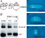 Fig. 1. Activation/repression of Xwnt-8 expression as a function of BMP-4 RNA dose. The effect of changes in the level of Xwnt-8 expression as a function of the level of BMP-4 in LiCl-dorsalized embryos. The expression level of Xwnt-8 was analyzed by RT-PCR and the phenotype of LiCl-treated embryos was determined at stage 34/35. (A) RT-PCR analysis of Xwnt-8 expression in LiCl-dorsalized embryos injected with increasing amounts of BMP-4 mRNA, histone H4 served as a loading control. (B) Control untreated embryos. (C) Phenotype of embryos dorsalized by partial LiCl treatment. (D) Embryos dorsalized by partial LiCl treatment and injected with 0.1 ng of BMP-4 mRNA appear almost normal. (E) Injection of 0.5 ng of BMP-4 capped RNA into embryos treated with partial LiCl results in reversal of the LiCl effect to a ventral phenotype. (F) Further increase in the amount of BMP-4 mRNA injected to 1.0 ng into partial LiCl dorsalized embryos results in strong ventralization.