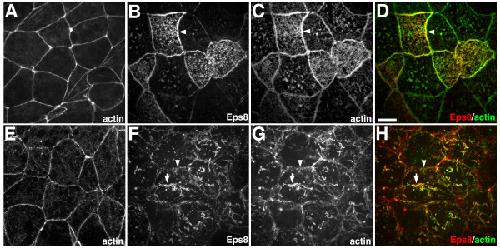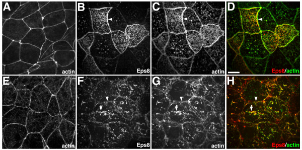 Figure 3. Eps8-induced actin remodeling in Xenopus embryos. Distribution of actin (A,C,D,E,G,H) revealed by phalloidin staining and Eps8-myc (B,D,F,H) revealed by 9e10 anti-c-myc antibody in animal cap cells of Xenopus embryos. In control animal caps, actin filaments are enriched at cell-cell junctions in superficial epithelial cells (A) and the cortex of deep cells (E). (B-D) In superficial epithelial cells, Eps8 expression causes an enrichment of actin filaments at cell-cell junctions (arrowheads). (F-H) In deep cells facing the blastocoel, Eps8 expression induces the formation of actin cables (arrowheads). (D,H) Eps8 is red and actin is green in merged images. Scale bar is equal to 10 μm.