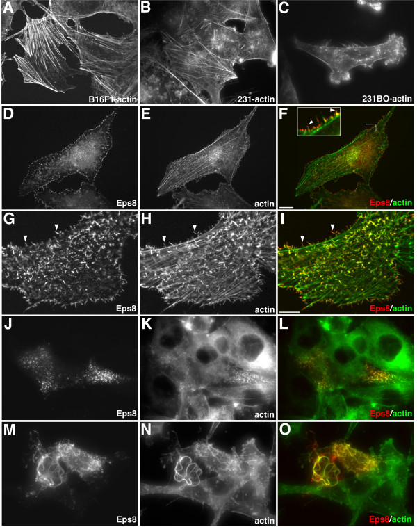 Figure 1. Eps8 induced actin remodeling in cultured cells. Phalloidin staining of the actin cytoskeleton in untransfected (A) B16F1, (B) MDA-MB231, and (C) MDA-MB231BO cells. Cells possess few filopodia-like structures extending from lateral and dorsal surfaces and do not possess cytoplasmic actin cables. Actin structures induced by Eps8 in (D-I) B16F1, (J-L) MDA-MB231, and (M-O) MDA-MB231BO cells. Distribution of Eps8-myc (D,G,J,M) revealed by 9e10 anti-c-myc antibody and actin (E,H,K,N) revealed by phalloidin staining in fixed cells. Right column (F,I,L,O) shows merged images with Eps8-myc in red and actin in green. The boxed region in (F) is enlarged in the inset. Eps8 induces the formation of filopodia-like structures in B16F1 and MDA-MB231 cells and localizes to filopodia-like structures, ruffles, and actin cables in MDA-MB231BO cells. In B16F1 cells, Eps8 localizes along the length of the filopodia-like structures (arrowheads in G-I) and is enriched at their tips (arrowheads, inset in F). Scale bar is equal to 10 μm in (A-F) and (J-O) and 5 μm in (G-I).