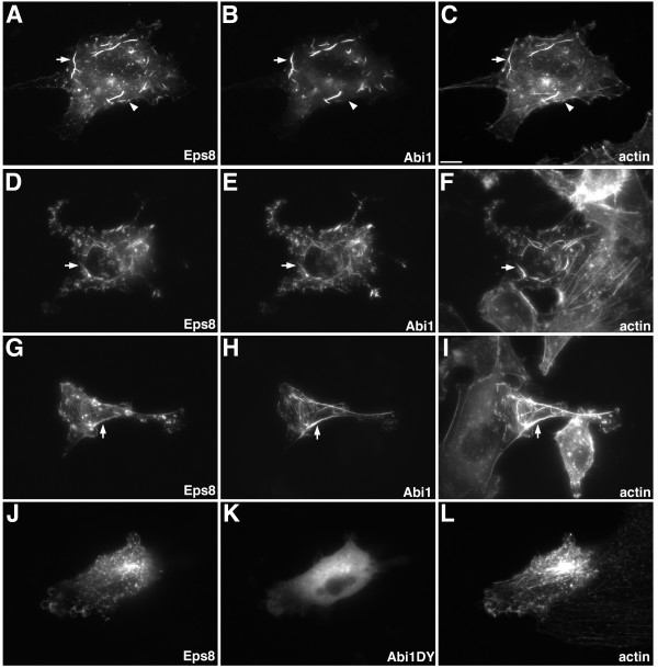Figure 2. Abi1 modulates the morphology of actin structures induced by Eps8. Actin structures induced by Eps8 and Abi1 in (A-C) B16F1, (D-F) MDA-MB231, and (G-I) MDA-MB231BO cells. Distribution of Eps8-myc (A,D,G,J) revealed by 9e10 anti-c-myc antibody, Abi1-GFP (B,E,H), and Abi1DY-GFP (K) revealed by GFP, and actin (C,F,I,L) revealed by phalloidin staining in fixed cells. (A-I) Simultaneous expression of Eps8 and Abi1 induces the formation of actin cables in B16F1, MDA-MB231, and MDA-MB231BO. Eps8 and Abi1 co-localize in association with actin cables (arrows) but Abi1 is not enriched with Eps8 in filopodia (arrowheads in A-C). (J-L) Formation of actin cables in B16F1 cells is dependent on the interaction of Eps8 and Abi1. Abi1DY does not co-localize with Eps8 and does not induce actin cable formation. Scale bar is equal to 10 μm.