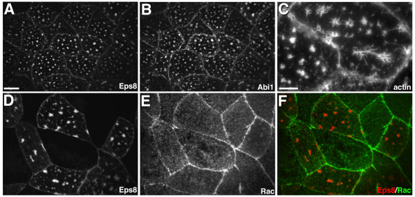 Figure 4. Abi1 modulates Eps8-induced actin remodeling in a Rac-independent manner. Distribution of Eps8-myc (A,D), Abi1GFP (B), actin (C) revealed by phalloidin staining, and Rac (E,F) in Xenopus animal cap cells. (A-C) Simultaneous expression of Eps8 and Abi1 induce the formation of actin stars at the apical surface of superficial epithelial cells. (D-F) Endogenous Rac is not recruited to Eps8/Abi1-induced actin stars. (F) Eps8 is red and Rac is green in the merged image. Scale bar is equal to 10 μm in A,B and D-F and to 5 μm in C.