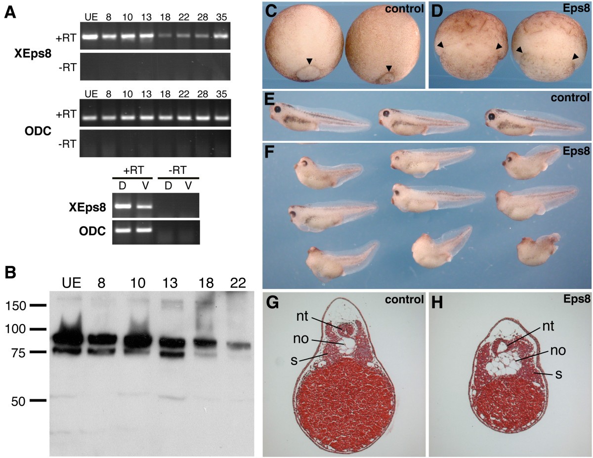 Figure 7. Mis-expression of Eps8 results in gastrulation defects. (A) RT-PCR analysis of the developmental expression of XEps8. ODC serves as a control for RNA isolation and reverse transcription. (B) Western blot probed with anti-XEps8 antibodies show that XEps8 protein is provided maternally and is present in gastrula, neurula, and tailbud stage embryos. (C) Control and (D) Eps8-injected embryos at stage 12. In control embryos the blastopore is well formed and has progressed vegetally (arrowheads). In contrast, Eps8-injected embryos display severe buckling of tissue above the blastopore (arrowheads) and a disorganized blastopore lip that is delayed and malformed. (E) Control stage 37/38 embryos. (F) Eps8-injected embryos show a range of phenotypes including microcephaly, cyclopia, and shortening and arching of the A-P axis. Top = low dose (50 pg); middle = intermediate dose (200 pg); bottom = high dose (1 ng). (G,H) Histological analysis of Eps8-injected embryos shows that Eps8 expression causes a broadening of the notochord (no) and disorganization of the neural tube (nt) and somites (so).