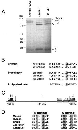 FIG. 3. Characterization of the sites at which BMP-1 and mTLL-1 cleave mouse Chordin. (A) Electrophoretic patterns are compared for