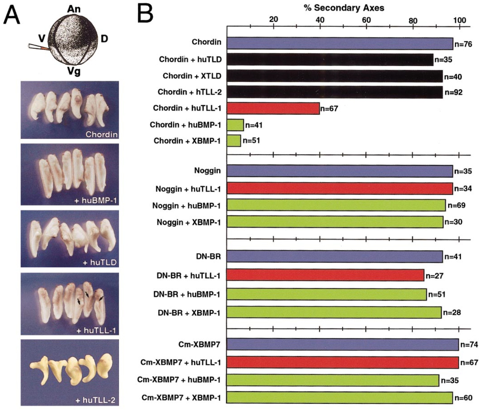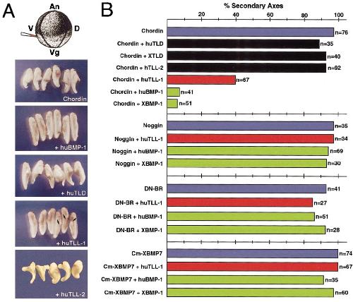 are denoted by arrows in the 1huTLL-1 panel. (B) Histogram showing the induction of secondary axes by Chordin, Noggin, a dominant