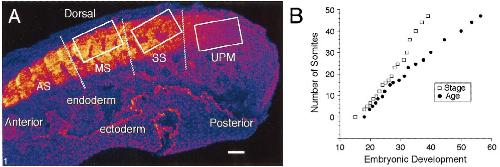 sections; bar, 100 mm. (B) Correlation of embryonic age (h) and stage (Nieuwkoop and Faber, 1967) with number of somites. Somite data