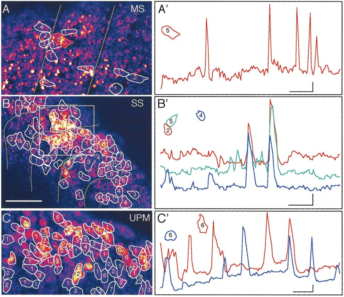 receptors in these regions coincides with the spontaneous production of Ca21 transients. (D–F) Responses in the more anterior MS and SS