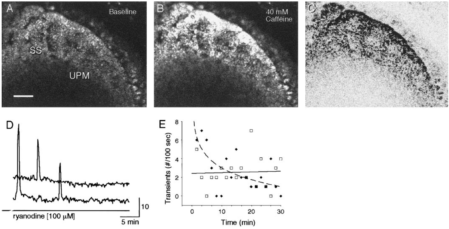 is shown by the absolute difference of pre- and postcaffeine images shown in A and B, in inverted format. (D) Ca21 transient activity in