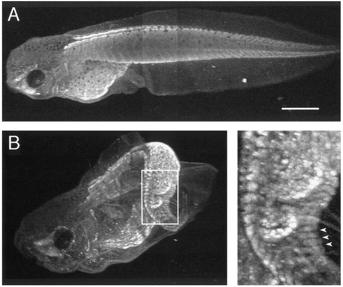 in the extraocular muscles and hypaxial musculature. Image is a z-series maximum projection of 50-mm confocal sections; bar, 500 mm. (B)