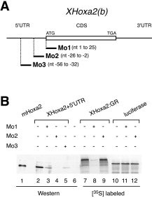 Figure 1. Inhibition of in vitro XHoxa2 translation by antisense morpholinos. A: Position of each morpholino with respect to the cDNA sequence of XHoxa2(b) (Pasqualetti et al.,2000). B: All three morpholinos, Mo1, Mo2, Mo3, significantly inhibit translation of XHoxa2 mRNA containing the 5â²UTR sequence, with a higher efficacy for Mo2 (lane 4) than Mo1 and Mo3 (lanes 3 and 5, respectively). Lane 6 is a negative translation control in the presence of pBluescript. Mo2 (or Mo3, data not shown) did not affect translation of XHoxa2:GR mRNA lacking the target 5â²UTR sequence (lane 9), whereas Mo1 is still effective in blocking translation (lane 8). Mo1 and Mo2 have no effect on the translation of the unrelated template luciferase mRNA (lanes 11,12). Lanes 1 to 6: Western blot of XHoxa2 in vitro translated products with a Hoxa2 mouse specific antibody recognizing both mouse (lane 1) and Xenopus (lane 2) Hoxa2 protein. Lanes 7 to 12: Autoradiography of 35S-labeled translated products.