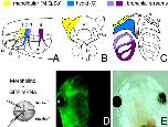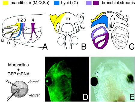 Figure 2. Migration and contribution to dorsal and ventral cranial skeletal elements of individual neural crest segments. AâC: Modified from Sadaghiani and Thiebaud (1987) and Newman et al. (1997). The mandibular crest segment (1; yellow) contributes to Meckel's (M), palatoquadrate (Q), and subocular (So) cartilages, the hyoid crest segment (2; blue) contributes to the ceratohyal (C) cartilages, and the anterior (3; pink-purple) and posterior (4; red) branchial crest segments contribute to the ceratobranchial cartilages of the gills. D,E: Embryos were coinjected in one or two blastomeres at the two- or four-cell stage with morpholino oligos and RNA encoding lineage tracers (GFP and/or β-galactosidase). Embryos (not shown) or tadpoles were selected for asymmetric distribution of the lineage tracer in half of the head region before in situ hybridization or skeletal staining, respectively. In D is shown the ventral view of a living injected tadpole in which half of the head cartilages are fluorescent due to GFP expression. E shows the same specimen in bright field illumination. ET, ethmoid-trabecular plate.