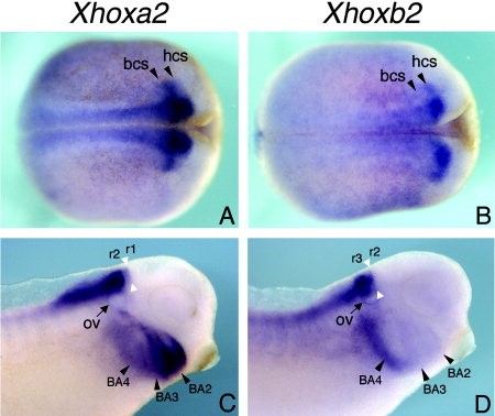 in situ hybridizations with XHoxa2 (A,C) and XHoxb2