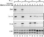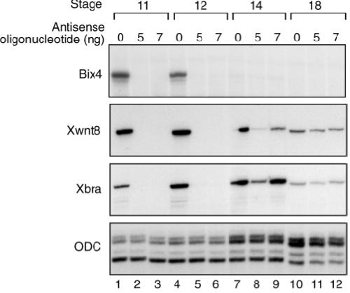 Fig. 1. Bix4 expression is abolished in embryos depleted of maternal VegT RNA. Embryos derived from uninjected oocytes or from oocytes injected with 5 or 7 ng VegT antisense oligonucleotides were analysed by RNAase protection at stages 11, 12, 14 or 18 for expression of Bix4, Xwnt8, Xbra and ODC. Depletion of VegT RNA prevents expression of Bix4 and delays expression of Xwnt8 and Xbra.