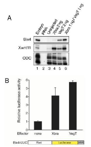 Fig. 2. VegT and Xbra induce expression of endogenous Bix4 and of Bix4 reporter constructs. (A) Expression of Bix4 is induced in animal caps in response to Xbra (weakly), VegT, and a combination of both T-box genes. Embryos at the 2-cell stage were injected with the indicated RNAs. Animal pole regions were dissected at stage 8, cultured to stage 10.5, and then assayed by RNAase protection for expression of Bix4, Xwnt11 and ODC. (B) Both VegT and Xbra activate expression of a Bix4 reporter construct. Embryos at the 2- cell stage were injected with 20 pg Bix4-LUC, 10 pg pRLTK and, where indicated, 250 pg Xbra or VegT RNA. Animal caps were dissected at stage 8 and groups of five were assayed in triplicate for Firefly and Renilla luciferase activities 3.5 hours later. Firefly luciferase activities were then normalised to Renilla activities. Error bars indicate standard deviations.