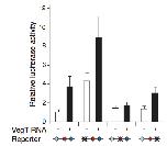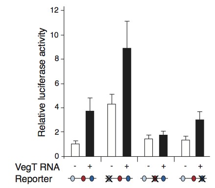 Fig. 4. Mutation of any of the three T-box sites alters the activity of Bix4-LUC in response to VegT in animal caps. Embryos at the 2-cell stage were injected with 20 pg Bix4-LUC, 10 pg pRLTK and, where indicated, 250 pg VegT RNA. Animal caps were dissected at stage 8 and groups of five were assayed in triplicate for Firefly and Renilla luciferase activities 3.5 hours later. Firefly luciferase activities were then normalised to Renilla activities. Each measurement represents the average of three separate experiments; error bars indicate standard errors.