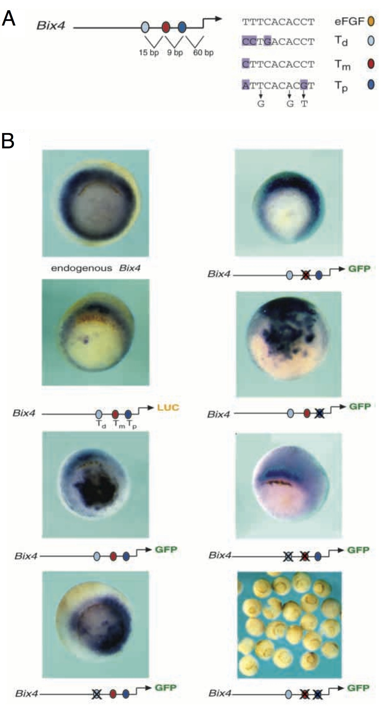 Fig. 3. Three T-box-related binding sites are required for expression of Bix4 reporter constructs in the mesoderm and endoderm of Xenopus early gastrulae. (A) Locations (left) and sequences (right) of three 10 bp sites in the Bix4 promoter that show homology to the T binding site (Tada et al., 1998): Td, the site most distal to the transcription start site (light blue oval); Tm, the middle site (red oval); Tp, the site most proximal to the transcription start site (dark blue oval). The sequence of the Xbra binding site in the eFGF promoter (Casey et al., 1998) (orange oval) is shown for comparison. Purple boxes indicate base pairs that differ between the four sequences and arrows indicate the mutations made in each site.