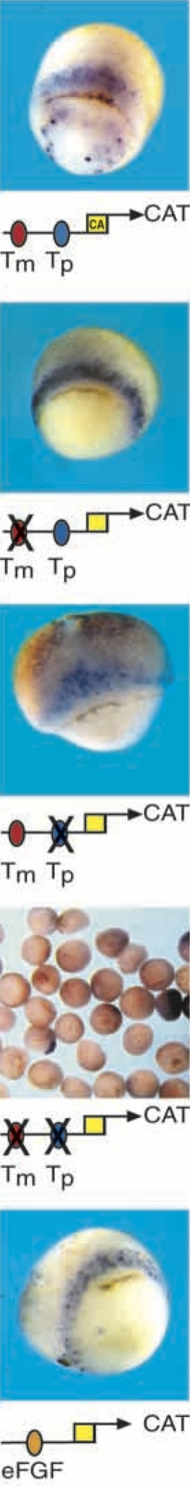 Fig. 5. A 42 bp Bix4 promoter element containing two T-box binding sites (Tm and Tp) drives reporter gene expression in the mesoderm and endoderm of the Xenopus early gastrula. Mutation of either site (represented by Xs) causes loss of expression in the endoderm, with mutation of the Tp site also causing a reduction in mesodermal expression. Mutation of both sites abolishes germlayer-specific expression. A single 10 bp T-box binding site derived from the eFGF promoter is sufficient to drive expression throughout the presumptive mesoderm. Tm, Tp and eFGF T-box binding sequences are shown in Fig. 3A. Yellow box indicates the CSKA minimal promoter.