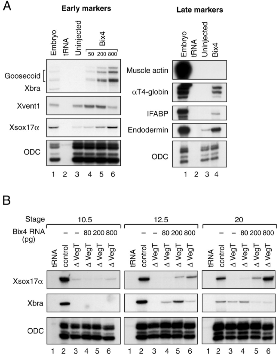 Fig. 6. Bix4 induces endodermal and some mesodermal markers in animal caps and rescues (albeit belatedly) expression of Xsox17α and Xbra in VegT-depleted embryos. (A) Misexpression of low concentrations of Bix4 elevates expression of Xvent1 in animal caps assayed at stage 10.5, while high concentrations induce goosecoid and Xsox17α. At stage 34, 200 pg Bix4 induces expression of αT4-globin, IFABP and endodermin. Bix4 RNA was injected into Xenopus embryos at the 2-cell stage, and animal caps were dissected at stage 8 and cultured to stages10.5 (early) or 38 (late) when they were analysed by RNAase protection. (B) Bix4 causes belated rescue of mesodermal and endodermal markers in embryos depleted of maternal VegT RNA. Embryos lacking maternal VegT (∆VegT) were injected with the indicated amounts of Bix4 RNA at the 2-cell stage into the vegetal hemisphere. They were allowed to develop to stage 10.5, 12.5 or 20 and were then analysed by RNAase protection for expression of Xsox17α, Xbra and ODC.