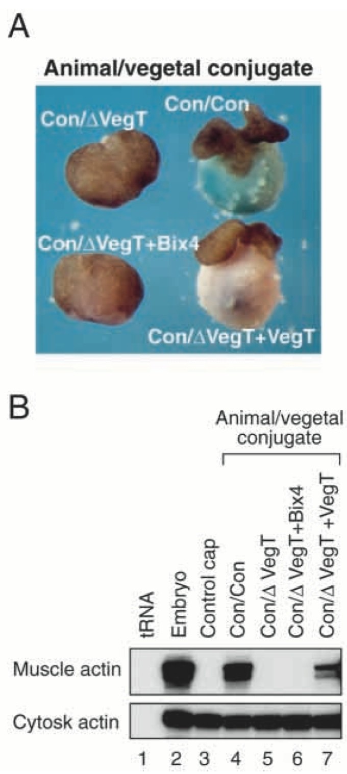 Fig. 7. Bix4 does not restore the ability of VegT-depleted vegetal pole regions to induce mesoderm. (A) Unlike VegT, Bix4 cannot restore to VegT-depleted vegetal pole regions the ability to induce animal caps to undergo mesoderm-specific morphological movements (Symes and Smith, 1987). VegT-depleted embryos were left uninjected (∆VegT) or received injections of 200 pg Bix4 or 200 pg VegT RNA. Vegetal pole regions derived from such embryos or from control embryos (Con) were dissected at stage 8 and juxtaposed with animal pole regions from control embryos. They were cultured to stage 16 and photographed. (B) Unlike VegT, Bix4 cannot restore to VegT- depleted vegetal pole regions the ability to induce animal caps to express muscle-specific actin. Animal cap-vegetal pole conjugates were prepared as in (A), but animal pole regions were separated from the vegetal tissue after 2 hours (Zhang et al., 1998) and cultured alone to stage 25 when they were analysed by RNAase protection.