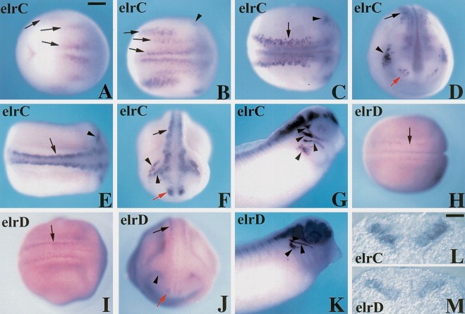 Fig. 1. Developmental patterns of elrC and elrD expressions. Whole mount in situ hybridizations of elrC (A±G) and elrD (H±K). (A) Stage 12, dorsal view: elrC is expressed in longitudinal stripes (arrows), parallel to the anteriorposterior axis, corresponding to primary neurons. (B) Stage 14, dorsal view. The primary neurons (arrows) and the trigeminal placodes (arrowhead) are labeled. Stage 17, dorsal (C) and anterior (D) views: the neural tube (arrow), the trigeminal placodes (arrowhead) and the olfactory placodes (red arrow) are labeled. Stage 20, dorsal (E) and anterior (F) views: in addition to the neural tube (arrow) and the olfactory placodes (red arrow), the developing cranial ganglia (arrowhead) are also labeled. (G) Stage 32, lateral view: elrC transcripts accumulate in the spinal cord, the brain and the cranial ganglia (arrowheads). Stages 17 (H) and 20 (I), dorsal views: elrD expression is detected in the neural tube (arrow). (J) Stage 20, anterior view. The neural tube (arrow), the trigeminal placode (arrowhead) and the olfactory placodes (red arrow) are labeled. (K) Stage 32, lateral view: elrD transcripts are found in the spinal cord, the brain and the cranial ganglia (arrowheads). In all dorsal views anterior is to the right. After whole mount in situ hybridization of elrC (L) or elrD (M), stage 18 embryos were sectioned. Expression of elrC and elrD in the neural tube are similar. Scale bar, (A±K) 300 um, (L,M) 60 um.