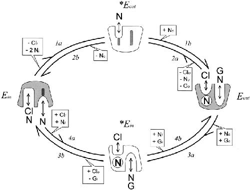 Figure 1. GAT1 cotransport model. The transporter cartoons are all oriented with the extracellular side facing upward. Substrate dependencies of each reaction are indicated in a box. (−) A reaction can occur only when the given substrate is not bound; (+) a reaction can occur only when the given substrate is bound. The model assumes the existence of two stable GAT1 states (Ein and Eout) and two transitional GAT1 states (*Ein and *Eout). In the Ein state, one Cl− (Cl) and two Na+ (N) can bind sequentially from the cytoplasmic side. When Ein binding sites are empty, a Na+ binding site can open to the extracellular side to form the *Eout state. One extracellular Na+ ion can be bound in the *Eout state and occluded into the transporter, thereby forming the Eout state. The Eout state can bind sequentially one Na+, one Cl−, and one GABA (G). When the Eout binding sites are fully occupied, a transition to the *Ein state can occur in which GABA and one Na+ can dissociate to the cytoplasmic side. Further opening of binding sites returns transporters to the Ein state. Conformational changes of the transitional states (1b, 2b, 3b, and 4b) are assumed to take place at infinite rates. See text for further details. |